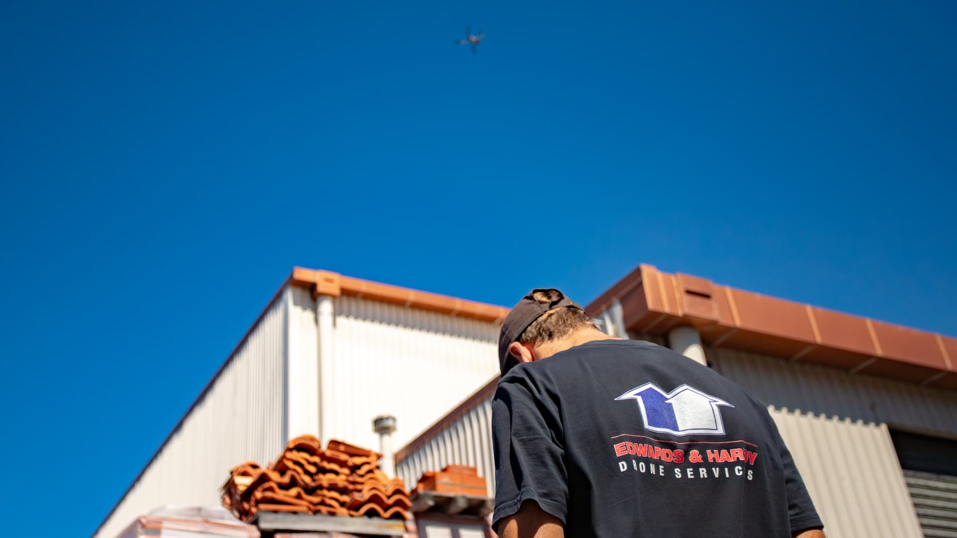 An Edwards & Hardy drone services operator oversees a roof inspection from the ground.