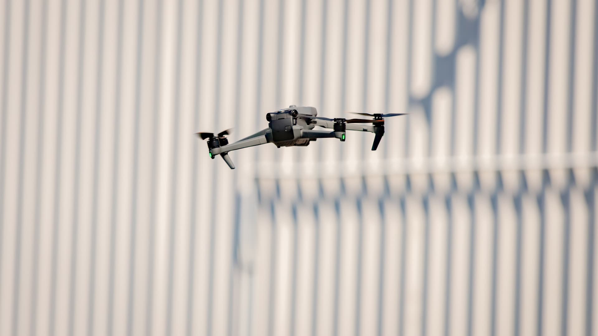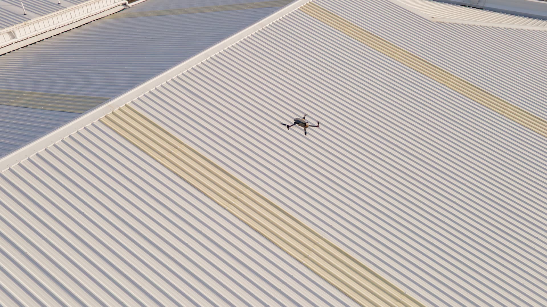 A drone manoeuvres alongside a corrugated commercial building, capturing detailed imagery of hard-to-reach surfaces.